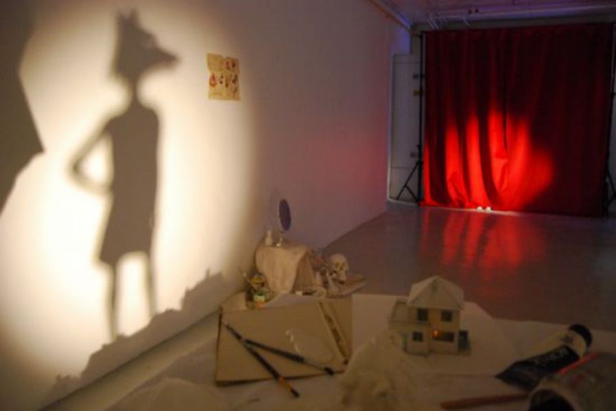 Face à cette table, quelques mètres devant, un rideau rouge, similaire aux rideaux de théâtre, encore fermé. La lumière du projecteur est dirigée vers les deux pâtes avant d’un loup sortant tout juste de dessous les rideaux ; la bête semble en posture calme, dans l’attente ; comme une avant-première qui tarderait à se révéler de la même manière à la bête et à nous.