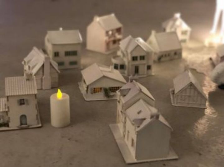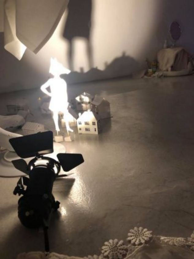 Tout d’abord il y a cette créature mi loup mi fillette (qui par un effet de jeu de lumière et d’ombre chinoise portée sur le mur d’exposition) qui domine un village miniature posé au sol, ce qui a pour effet de mettre en évidence la grande vulnérabilité et fragilité de la ville miniature face à cette menace éventuelle.