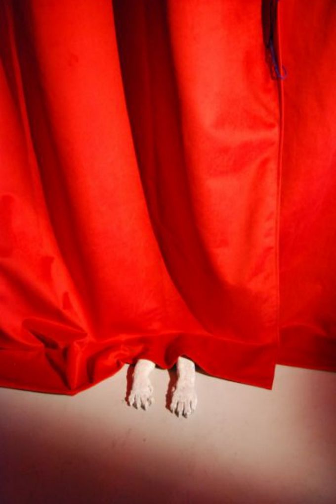 Ce rideau de théâtre est un peu comme une scène encore fermée qui nous dévoilerait peut être plus tard, un monde nouveau ou ancien qui se renouvellerait enfin ou pas … Cette « bête » menaçante (et que l’on entend grâce aux pistes sons de l’installation qui sont des bruits de mastications) se décidera-t-elle à nous dévorer ou nous épargnera-t-elle ? Et si cette créature étrange n’était en fin de compte qu’une face cachée de nous-même, non assumée ? Allons-nous alors accepter notre nature profonde et prendre part à ce qui se déroulera par la suite et se décider à jouer, voir « occuper » notre véritable rôle ?