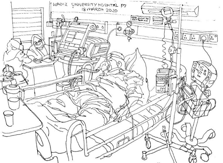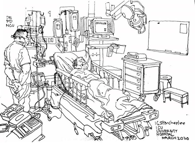Mais comme je suis déjà là pour une visite de toute façon, l'ICI avec tous ses gadgets médicaux et son attirail est un sujet d'esquisse fascinant. Et bien sûr, je rince et désinfecte à fond quand je rentre chez moi. Sans parler de l'auto quarantaine.
